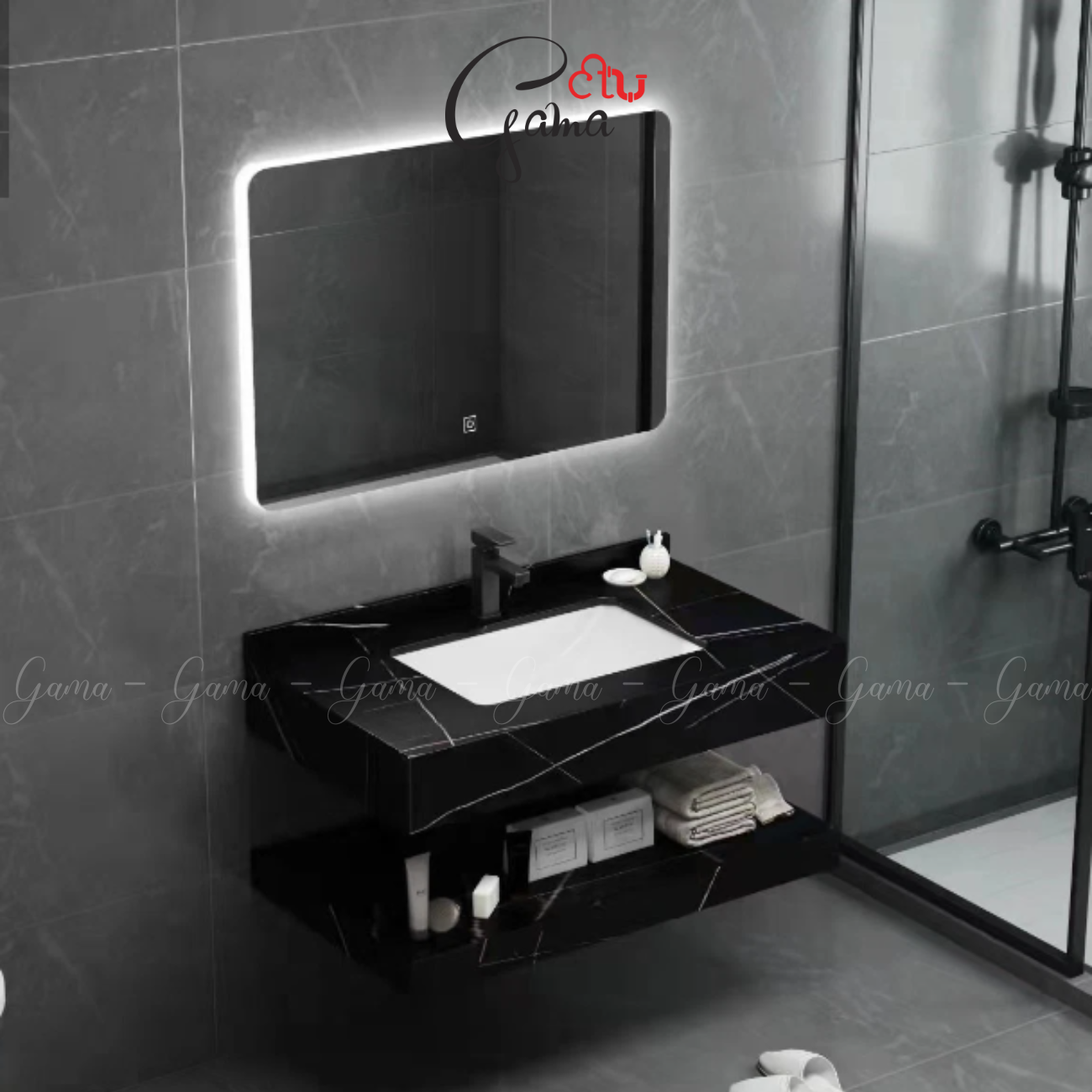 - Bộ tủ gương Lavabo đá Gama cao cấp GMBD8050D có mặt đen vân mây tươi mát, sạch sẽ giúp mang lại cảm giác tràn đầy năng lượng.