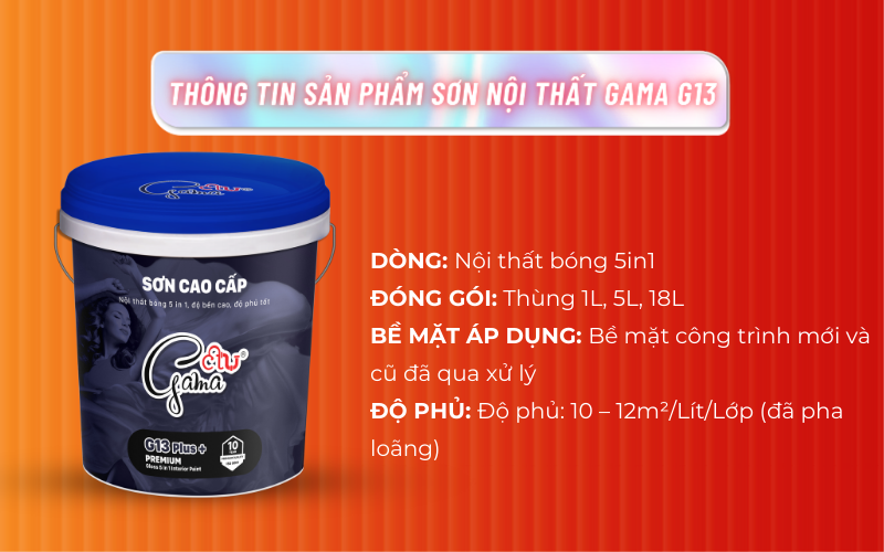 Gama G13 – Sơn nội thất cao cấp bóng 5 in 1 độ bền cao, độ phủ tốt là loại sơn trong nhà thế hệ mới được sản xuất dựa trên công nghệ tiên tiến nhất. Sản phẩm thân thiện với môi trường và thích hợp sử dụng cho nhiều không gian kiến trúc khác nhau.