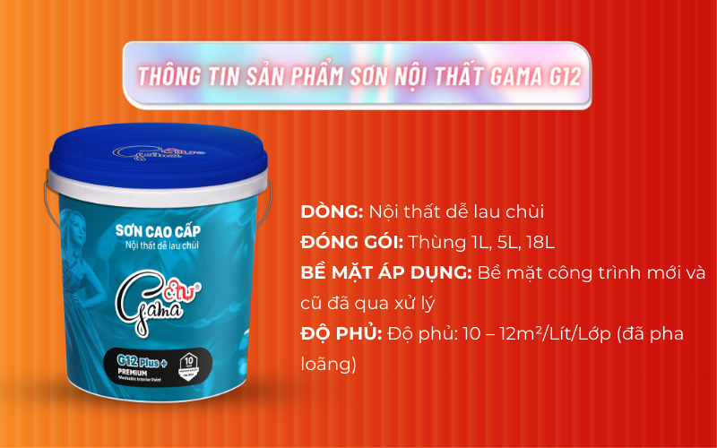 Gama G12 – Sơn nội thất cao cấp dễ lau chùi là dòng sản phẩm sơn nước với màng sơn Arylic sáng bóng dễ sử dụng trang trí nội thất với bộ sưu tập lên tới hơn 1000 màu. Sản phẩm hiện nay đang được Gama phân phối rộng rãi trên khắp các hệ thống chi nhánh, đại lý, đại lý độc quyền trên thị trường Việt Nam.
