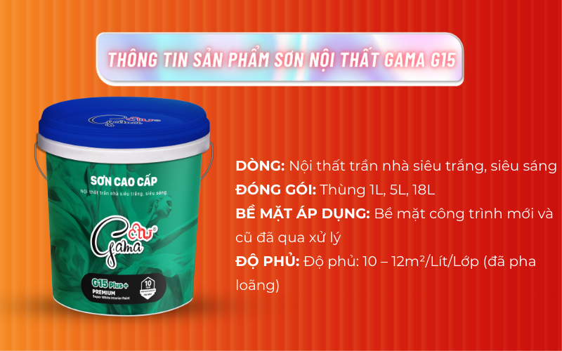 Gama G15 – Sơn nội thất cao cấp trần nhà siêu trang, siêu sáng là loại sơn nước Acrylic cho màng sơn siêu trắng sáng. Sản phẩm hiện nay đang được Gama phân phối rộng rãi trên khắp các hệ thống chi nhánh, đại lý, đại lý độc quyền trên thị trường Việt Nam.